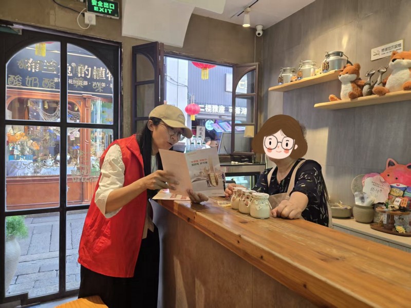 山塘街作为苏州知名的历史文化街区,聚集了大量餐饮、文创、零售等小微商户,由于日常经营繁忙,不少商户对新型金融诈骗手段了解有限,成为风险防范的薄弱环节。活动当天,志愿者们沿着山塘街的廊棚商铺逐一走访。