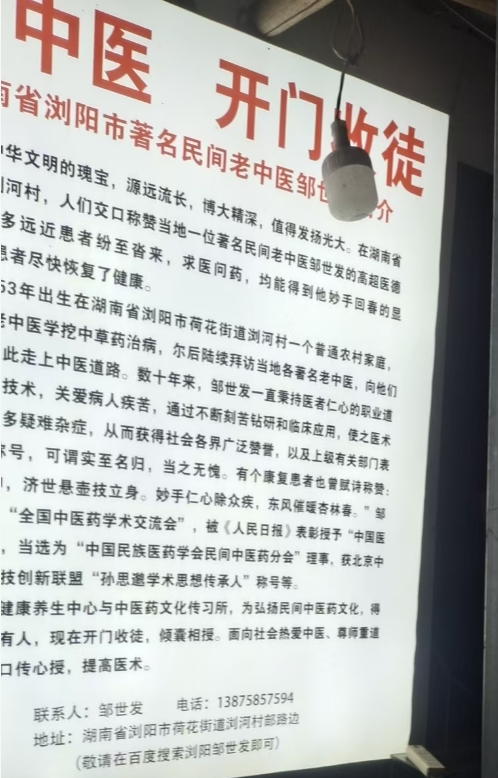 在湖南省浏阳市荷花街道浏河村,当地老中医邹世发的高超医德与医术广受赞誉,吸引了远近患者纷至沓来。许多经他诊治的患者,多能收获妙手回春的显着疗效,尽快恢复健康。