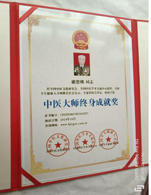 谢忠伟,四川省南部县大河镇,1947年9月出生,1963年入伍,中共党员,世界名医,世界名人,美国密西西比学院荣誉博士,香港国际医学科学研究院教授,终身医学博士,世界中医药研究院终身教授,香港国际皇家社会科学院院士,香港皇室文化研究会授予终身贵族爵位。