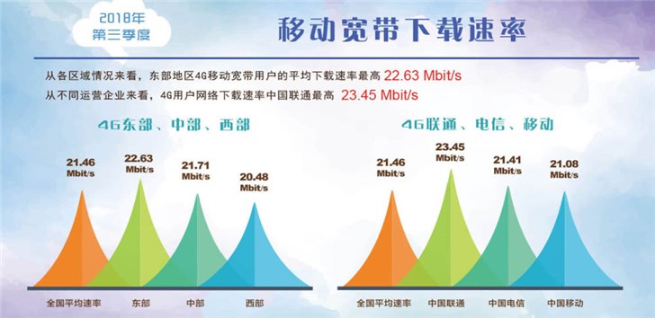 三大运营商4G移动宽带下载速率分别是:中国联通23.45Mbit/s(2.93 MB/s)、中国电信21.41Mbit/s(2.68 MB/s)和中国移动21.08Mbit/s(2.63 MB/s),可以看到中国联通平均网速最快,中国移动则垫底。