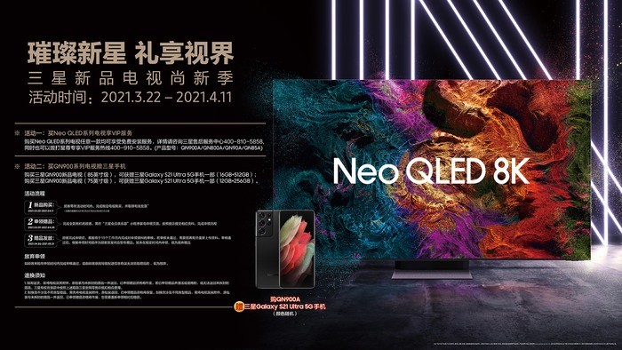 目前,三星Neo QLED 8K电视的预售活动已全面开启,凡在3月22日—4月11日活动期间,购买85英寸产品的用户可获得16GB+512GB三星Galaxy S21 Ultra手机一台,购买75英寸产品的用户可获得12GB+256GB三星Galaxy S21 Ultra手机一台。