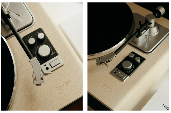 SEVIA以暖白荔枝纹皮革包覆机身,搭配一片式磨砂透明防尘盖与木质支架,呈现纯净、柔和之气质。荔枝纹皮革触感细腻、光泽柔和,为现代家居带来温暖的视觉与触觉体验;半透的磨砂防尘盖轻盈克制,保留唱机最干净的形态;而温润的木质保护盖支架,则在实用之外增添了一份自然气息。