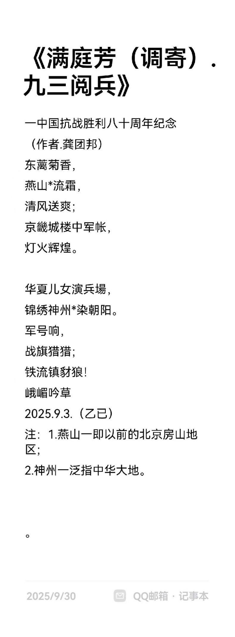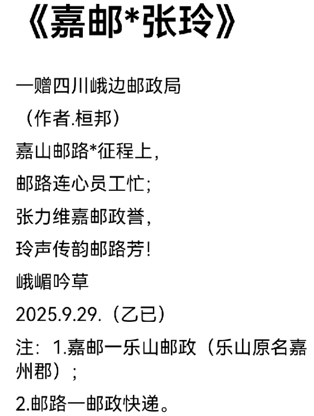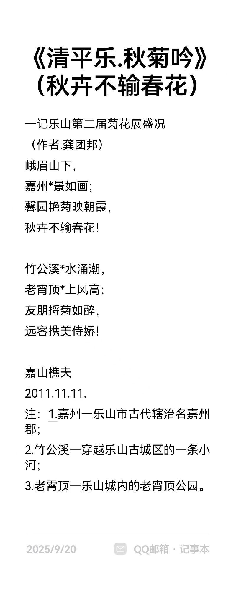 龚团邦,男,汉族,字杨铭,号《嘉玉阁》主人,中共党员,大专文化;一九五二年出生于四川省乐山县沙湾区老鸦乡,启蒙于乐山沙湾郭老(郭沫若)故乡—沙湾小学,受郭老影响较大,爱好文学和古典诗词的学习与创作。笔名汉邦、杨铭、怪老头、峨嵋吟草、乐山乐水、嘉山樵夫、凌云居士。