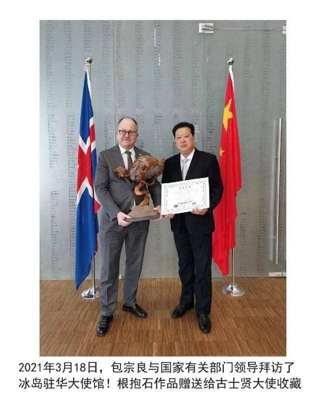 根抱石国礼系列作品让国家有关部门选送给智利、奥地利、塞尔维亚、保加利亚、阿尔巴尼亚、冰岛、厄瓜多尔、斯洛伐克、墨西哥、韩国、老挝、法国等驻华大使馆以及马耳他共和国前总理劳伦斯•贡齐先生的珍藏。