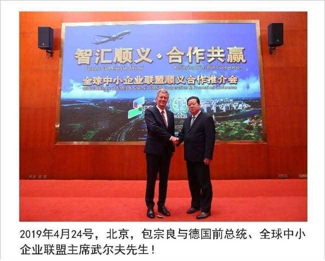 2019年4月24日,在北京顺义区,全球中小企业联盟顺义合作推介会上受到德国前总统,全球中小企业联盟主席武尔夫先生的亲切接见合影响留念。