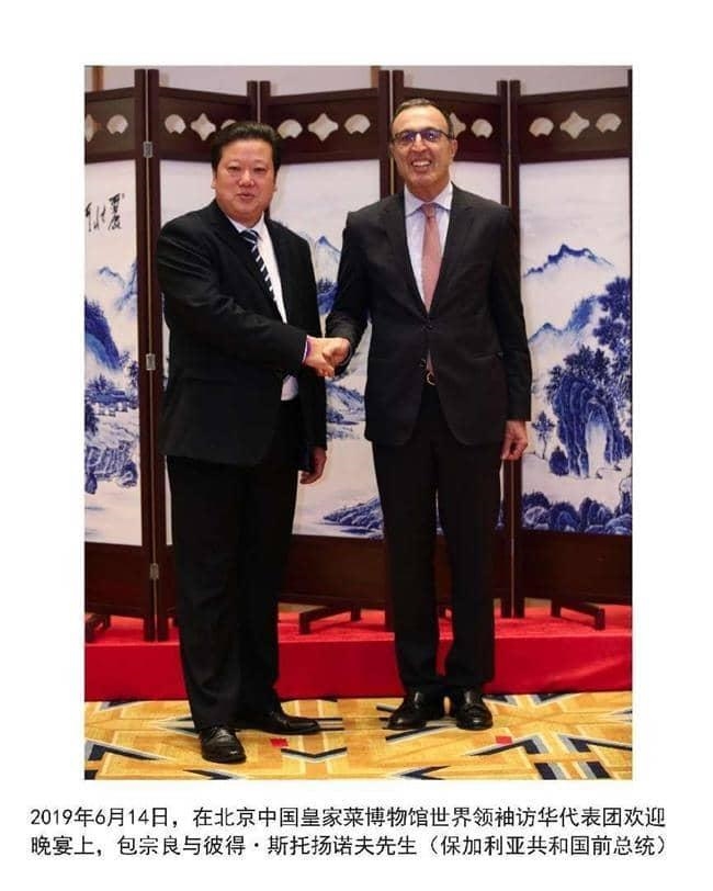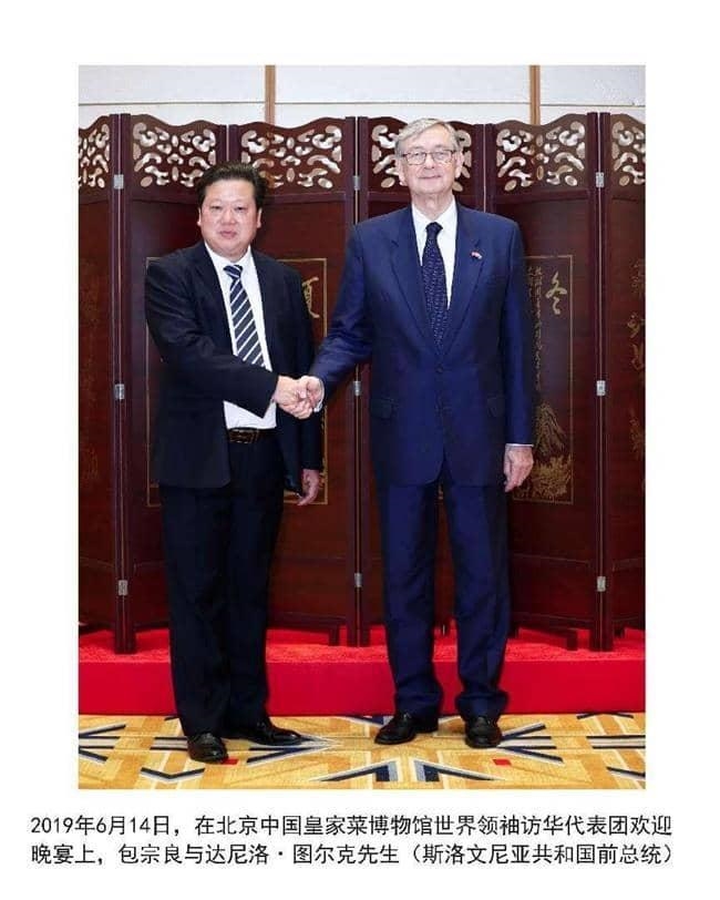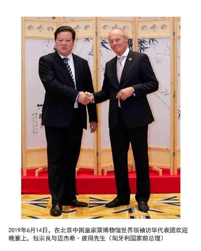 2019年6月14日,在北京御仙都皇家菜博物馆,世界领袖访华代表团欢迎晚宴上受到爱尔兰共和国前总理伯蒂•埃享先生、保加利亚共和国前总统彼得•斯托扬诺夫先生、玻利维亚共和国前总统豪尔赫•基罗加先生、马耳他共和国前总理劳伦斯•贡奇先生、斯洛文尼亚共和国前总统达尼洛•图尔克先生、圣马力诺共和国前总统吉安佛郎哥•泰伦齐先生、乌克兰共和国前总统维克托•尤先科先生、乌拉圭共和国前总统路易斯•阿尔韦托•拉卡列先生、匈牙利共和国前总理迈杰希•彼得先生的亲切接见合影留念。
