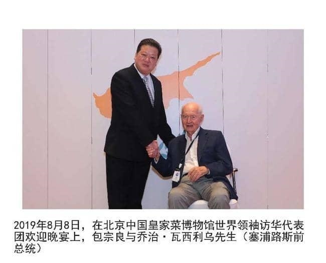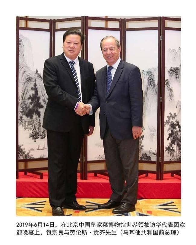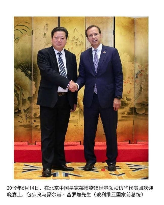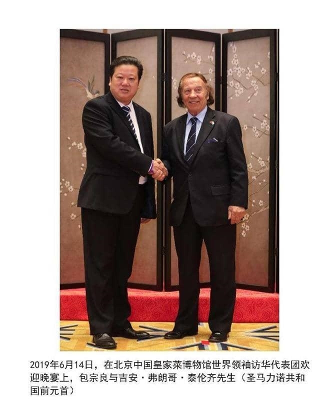 2019年8月8日,在北京御仙都皇家菜博物馆,世界领袖访华代表团欢迎晚宴上受到玻利维亚共和国前总统—基罗加先生、厄瓜多尔共和国前总统—乌尔塔多先生、哥斯达黎加共和国前总统—罗德里格斯先生、马耳他共和国前总理—贡齐先生、马里共和国前总统—马拉先生、墨西哥共和国前总统—卡尔德龙先生、塞浦路斯共和国前总统—瓦西利乌先生、斯洛文尼亚共和国前总统—图尔克先生、乌克兰共和国前总统—尤先科先生的亲切接见合影留念。