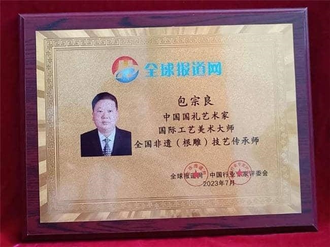 2023年7月,全球报道网,中国行业专家评委会授予(中国国礼艺术家)(国际工艺美术大师)(全国非遗根雕技艺传承师)。