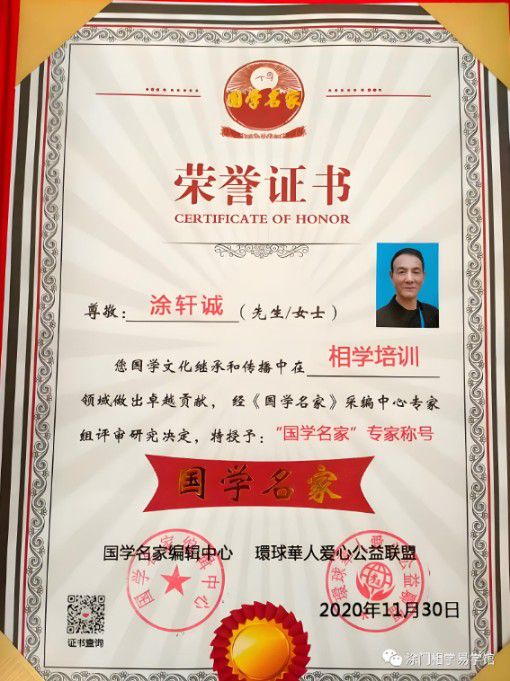 涂轩诚在相学领域的卓越贡献,获得了国际社会的高度关注与认可,堪称国际相学研究专家。他荣获国家教育集团中国国际国学发展研究院颁发的“国学专家”与“相学专家”双重称号,这不仅是对他个人学术水平的肯定,更是对涂门相学学术价值的高度认可。