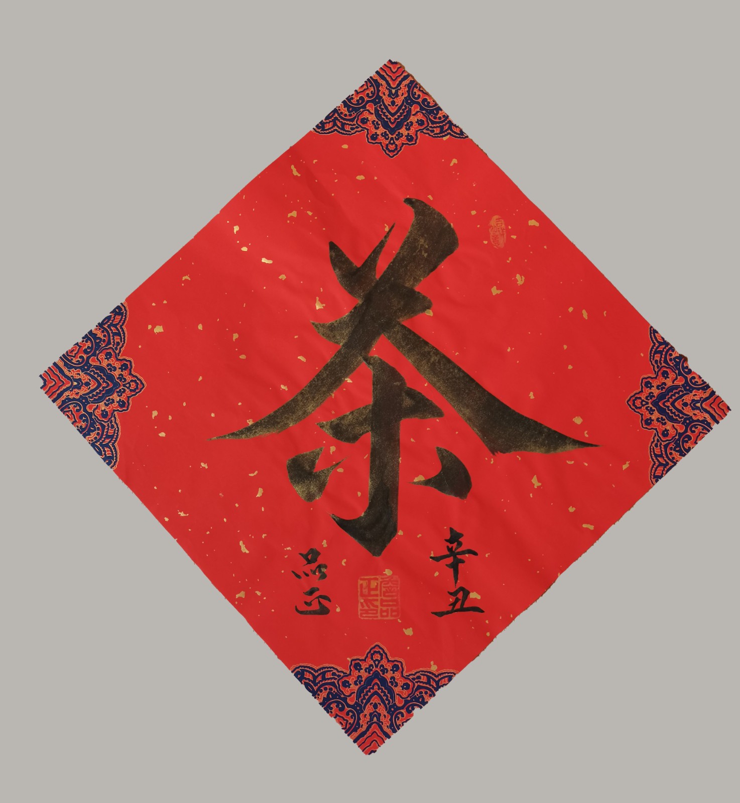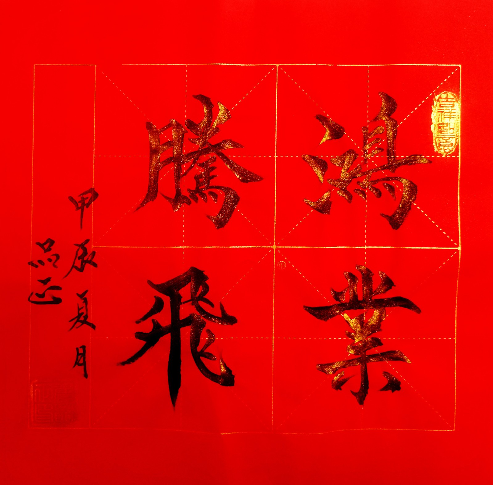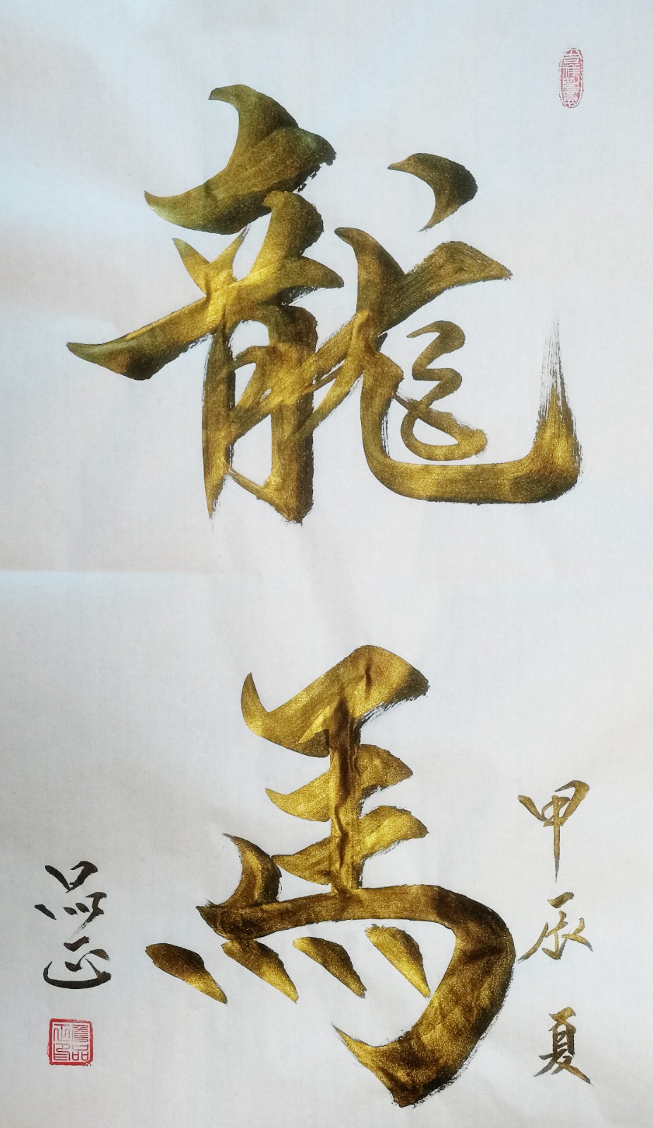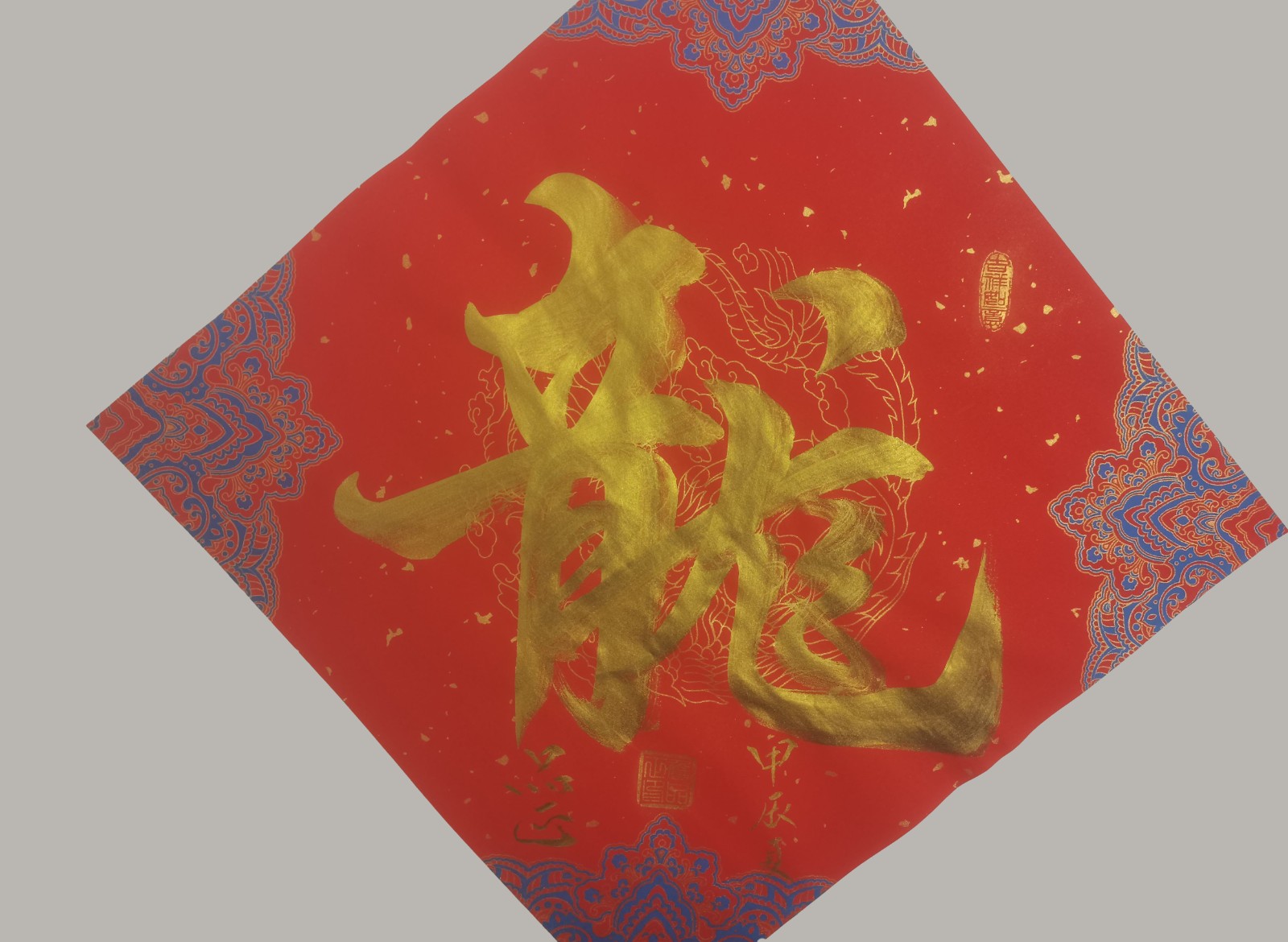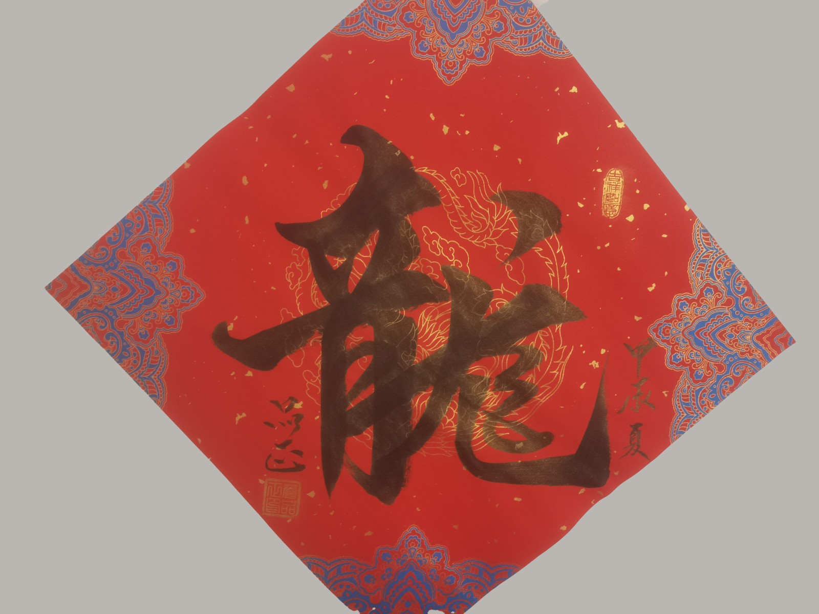如书法作品中的《龙》字极具视觉冲击力。从起源看,“龙”字源于远古对龙图腾的崇拜,它是多种动物形象融合的产物,象征着强大与力量。在传统文化里,龙是吉祥、权威的象征,代表着风调雨顺、五谷丰登,也寓意着杰出、不凡,此作品中“龙”字以豪放洒脱的笔法书写,墨色浓重,富有张力。其字体大气磅礴,笔画间尽显龙的腾跃之姿,威严而不失灵动。周围纹饰与金粉点缀,更添华贵。这“龙”字,既是传统文化的璀璨结晶,又以独特字体彰显着龙的无上神韵,令人心生敬畏。