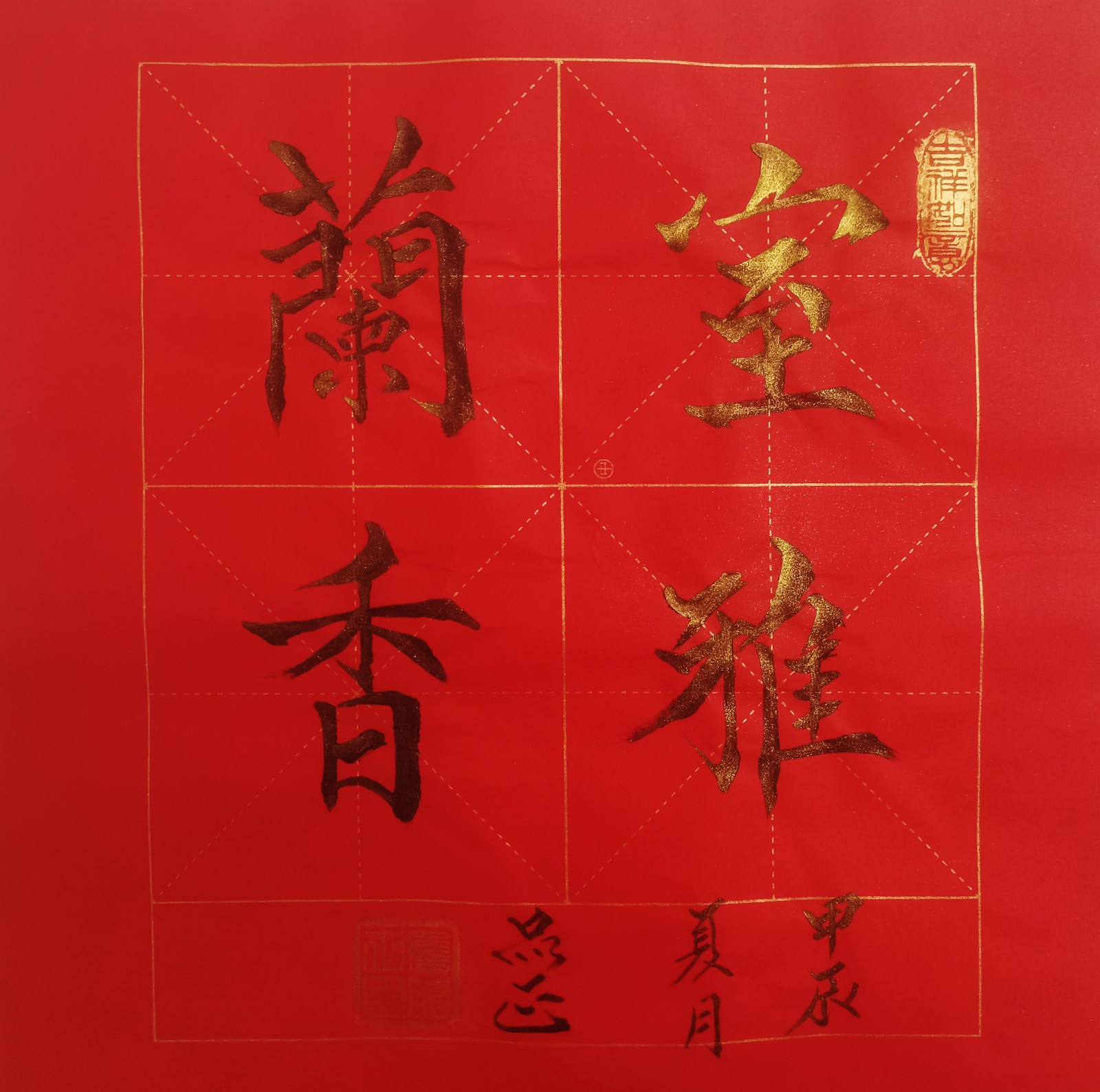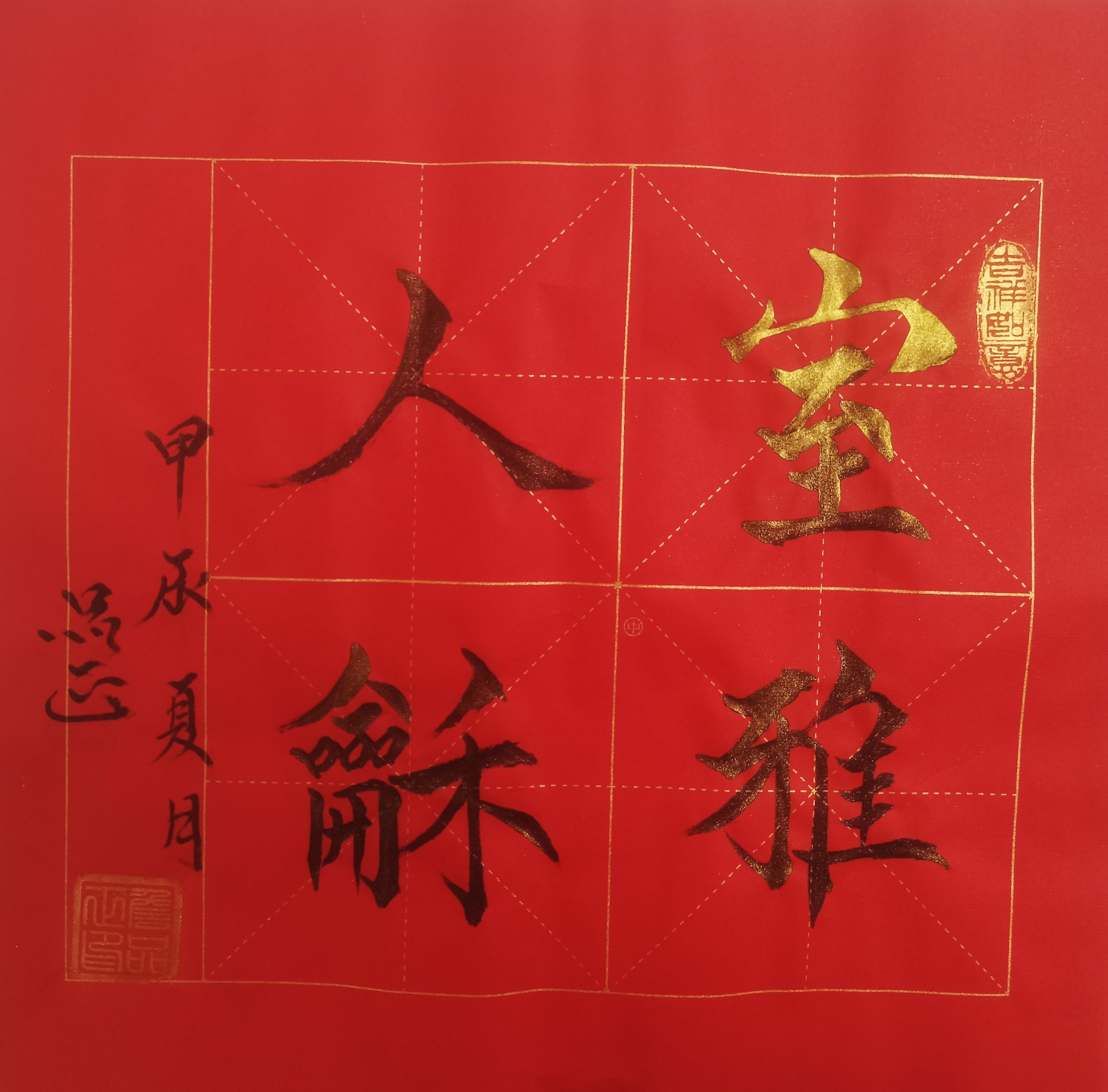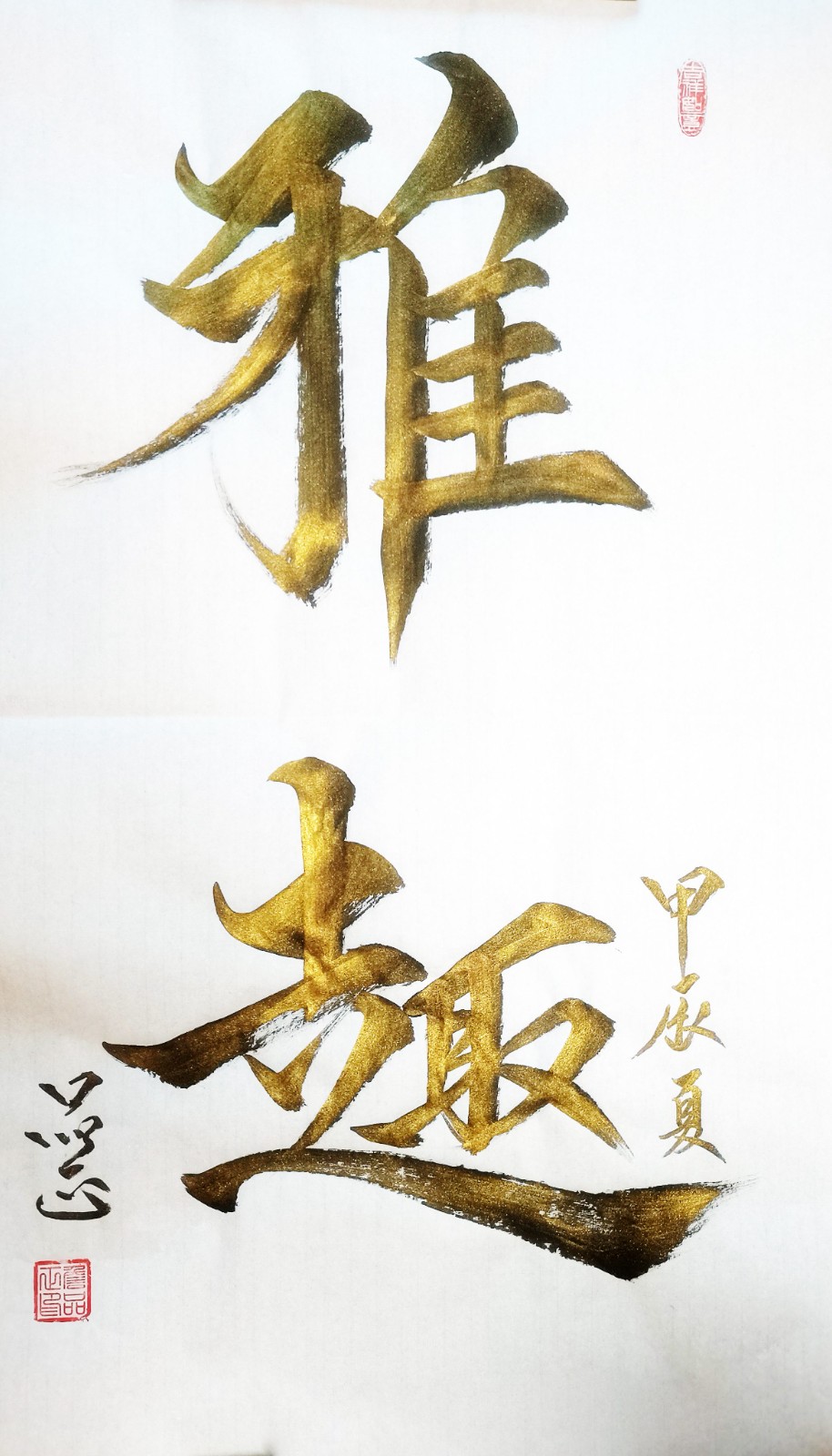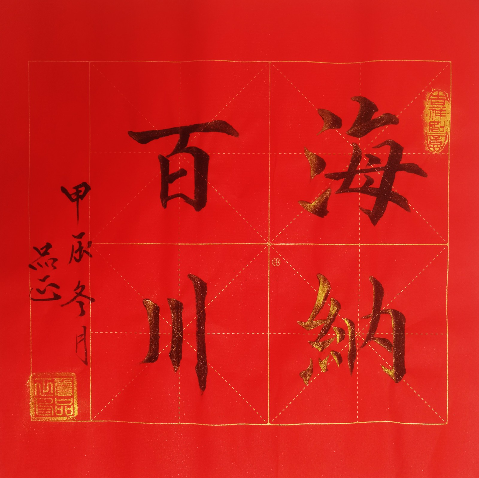 特别值得一提的是,詹品正对“楷、行、草、隶、篆”各体均有深入研究,尤以楷书见长。从他的作品中,我们可以清晰地看到他对传统笔法的精准掌握与创造性转化。例如,在《雅趣》作品中,“雅趣”二字以行书写就,笔画流畅自然,富有动感却不失法度,展现了他在传统基础上的个性表达;而在《海纳百川》作品中,字体规整饱满,端庄稳重,传递出豁达包容的精神境界,体现了书写者对传统文化的深刻理解与当代诠释。