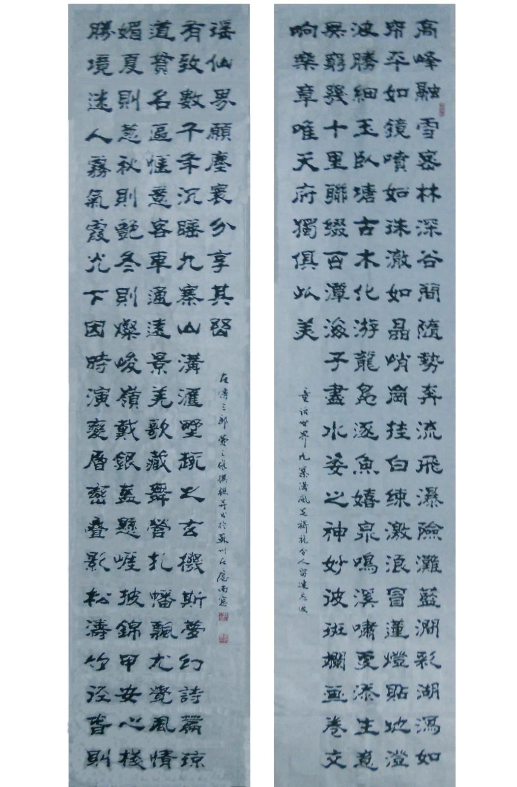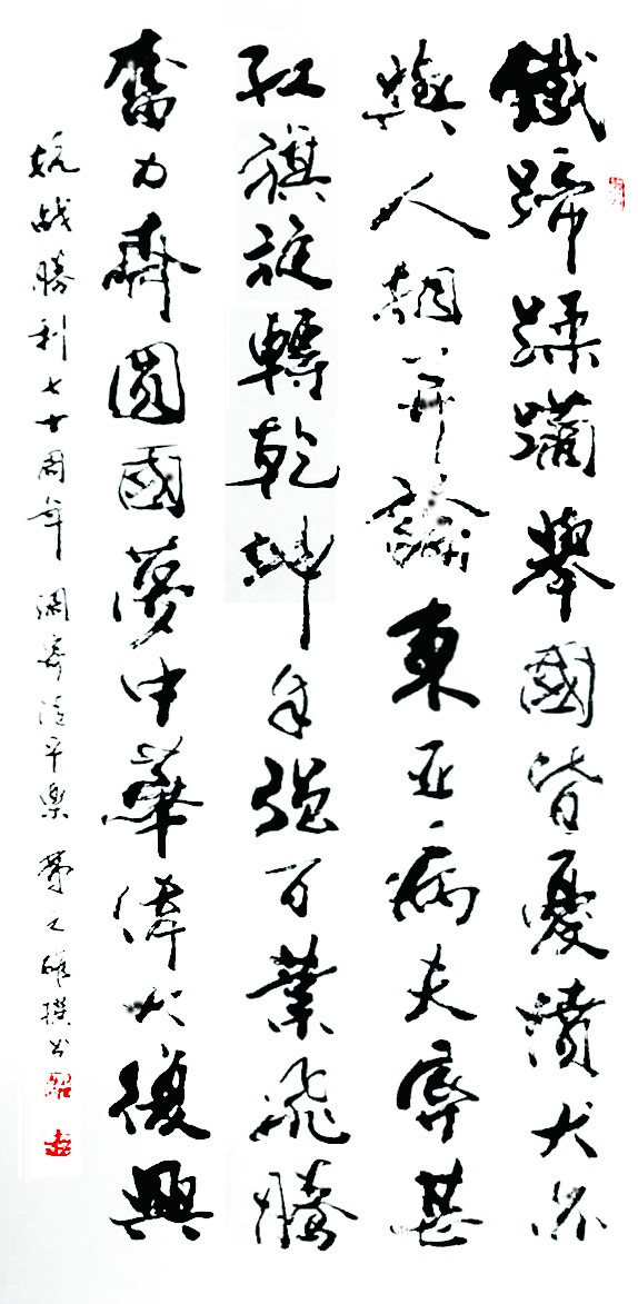 费之雄(左传三郎) 1934 年生于湖州, 得“新我左笔”亲授,曾从事中学语文教学、书法教学、美术设计、企业管理等工作。参与合写《书法基础》《中国古代书法家大辞典》,发表《书苑折枝》《与时俱进费新我》《系列书法创作谈》等,《奥运颂•2010 中国作家创作笔会》和《孙武颂•孙子兵法全球征文》一等奖。举办《一带一路宝塔联》《实干•圆梦》《十六书品》《十二生肖书画铭•文》等五十篇内容自撰、成组成套、创意内涵、创新表达的《费之雄系列书法展》,传递正能量,弘扬主旋律,把握时代方向、社会要求、人文情怀、艺术旨趣,发挥其“审美、教育、认知、娱乐”作用。书体幅式齐全,色采材质各异,诗词曲赋皆有,画印联文兼备,具有开创性意义的系列作品内容时代化,形式团队化,在苏沪浙闽鲁等地展览。各界撰文:“为古老书法艺术发展提供了一条新思路”“大树底下不乘凉”“新我之子亦新我” ,书法盛宴,古今尚无,与新我左笔构成两道风景。