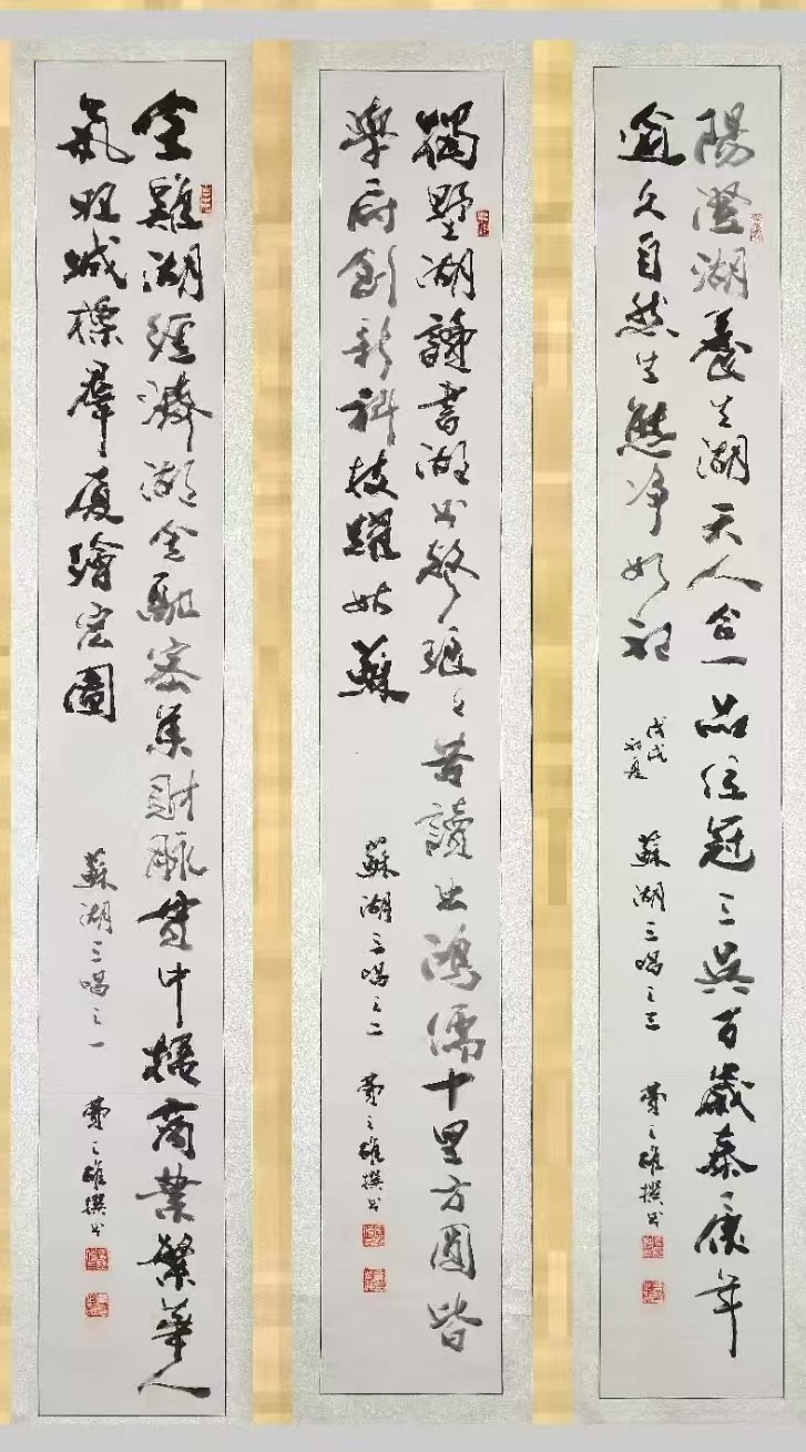 苏州,这座以“水乡泽国”闻名于世的江南名城,在费之雄的笔下被赋予了刚柔并济的双重品格。九旬高龄的费之雄,作为中国书法家协会会员、苏州市书法家协会顾问,不仅以“书之雄、联之雄、谜之雄”闻名艺坛,为苏州拟写刻用五十副对联,积累内容自撰,形式成套,创意内涵,创新表达五十套系列书法作品,更以深耕孙武研究二十八载的学术积淀,提出“文武苏州十项”构想。费之雄以艺术家的敏锐与学者的深邃,为苏州织就了一幅文武双全的双面绣。