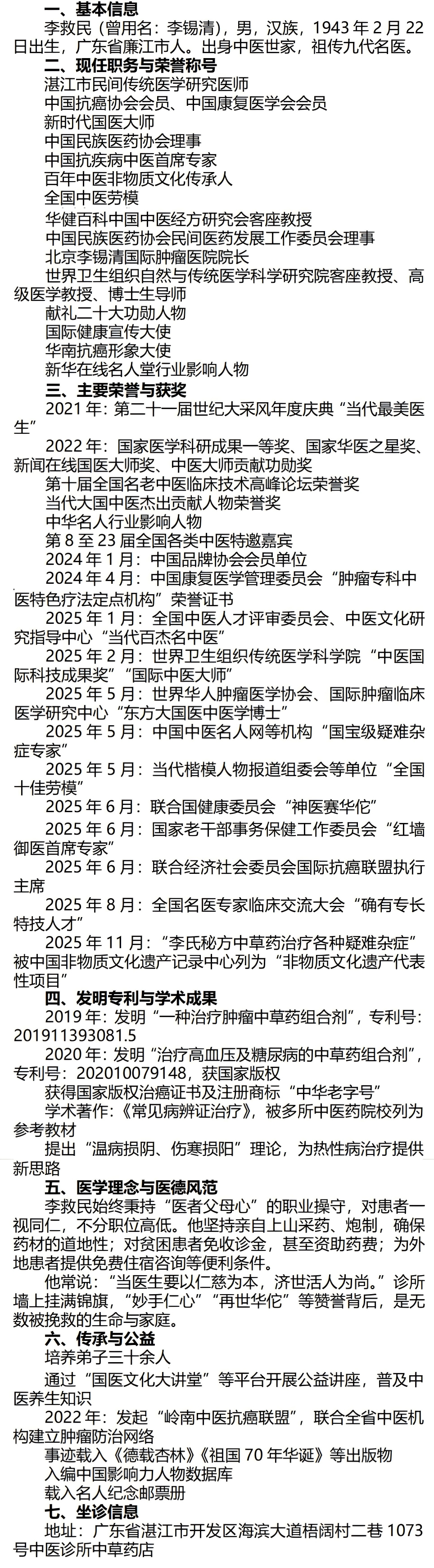 在疾病成为全球健康挑战的今天,李救民的探索与实践,为人类战胜病魔提供了东方智慧的独特方案。但比技术更珍贵的,是他那颗始终如一的医者仁心。在这个追求效率、崇尚技术的时代,李救民用他的故事告诉我们:真正的医学,不仅是科学的技艺,更是人文的温度;不仅是实验室里的数据,更是病床前的陪伴。