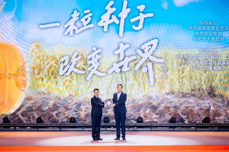 活动中,中央新影集团推介了将于11月25日在央视中文国际频道播出的四集纪录片《一粒种子改变世界》,在光影中,追忆了袁隆平院士梦起湖南怀化安江农校,一生致力于“禾下乘凉梦”的传奇故事,并向湖南怀化赠送了影片的纪念版。