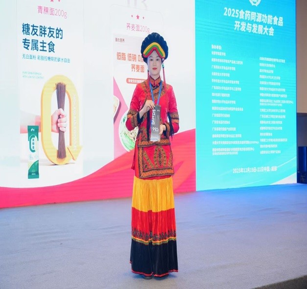 环太(集团)环太生物科技股份有限公司总经理陈剑雄在2025食药同源功能食品开发与发展大会上隆重发布药食同源苦荞新品:苦荞茶品、苦荞主食、苦荞低GI休闲食品。