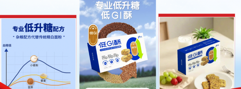 低GI酥,同样以荞、藜麦、青稞进行科学配伍,膳食纤维达28%,零添加, 血糖生成指数45.9。