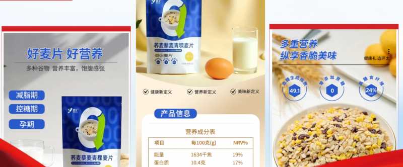 荞麦藜麦青稞麦片,同样以苦荞、藜麦、青稞进行科学配伍,膳食纤维达24%,零添加, 血糖生成指数49.1。