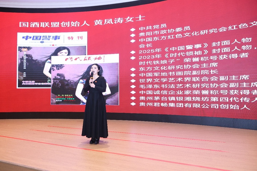 大会在庄严的仪式中开幕。国酒联盟创始人、时代领袖2023年封面人物黄凤涛女士率先作使命致辞。她不仅是企业家,更是红色文化的传承者与践行者,身兼贵阳市政协委员、世界文学艺术界联合会副主席等多重社会职务。她指出:“在经济下行、数字经济与国家战略深度融合的今天,单打独斗的时代已经结束。国酒联盟的使命,是以红色文化为魂,以数字技术为翼,构建一个‘共享、共赢’的品牌命运共同体,从根本上破解实体企业面临的流量之困、成本之压与增长之殇。”她分享了从发起国酒联盟,在酒业得到各酒企的拥护和共鸣,再到各行业的响应和期盼,发展到产业联盟的历程和初心。产业联盟,就是要让各企业抱团突围,实现数智化转型!